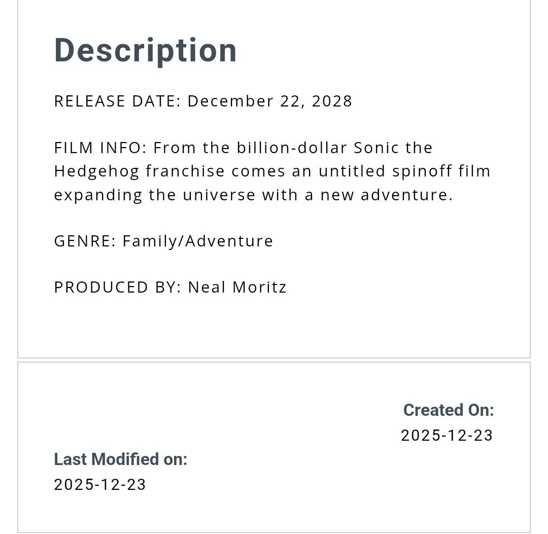 به طور رسمی پارامونت پیکچرز خبر از ساخت یک فیلم کاملا جدید با عنوان نامشخصی را داد که قرار است بعد از فیلم چهارم سونیک در تاریخ ۲۲ دسامبر سال ۲۰۲۸ (۲ دی ۱۴۰۷) اکران شود